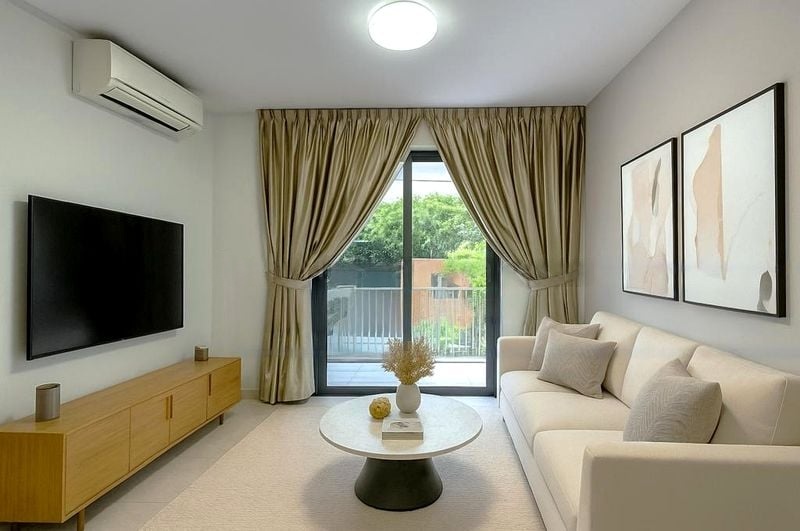 Step into a serene oasis where abundant natural light floods the open-concept living area, accentuating the polished floor tiles and modern minimalist finishes. The full-height windows and balcony offer stunning views of the pool and lush greenery, creating a tranquil ambiance that invites relaxation.