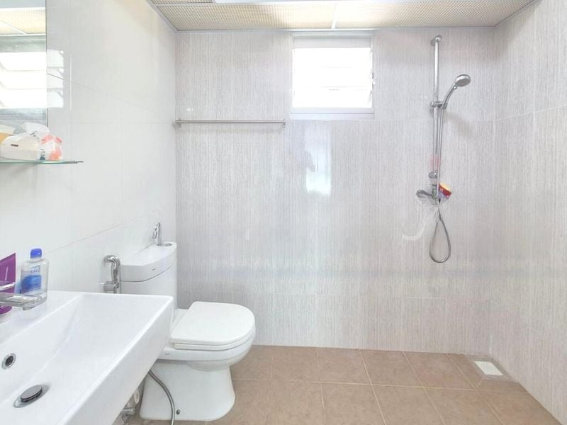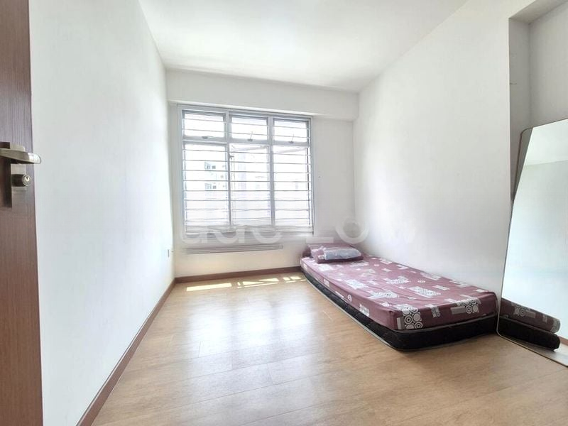 Step into a beautifully designed HDB flat that exudes modern eclectic charm, where abundant natural light dances through large windows, illuminating the white minimalist island kitchen and the vibrant decor of the oriental-themed master bedroom. The seamless integration of glass-walled spaces creates an airy ambiance, inviting you to experience the lush greenery and urban HDB estate views right from your living area.