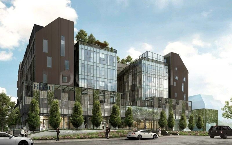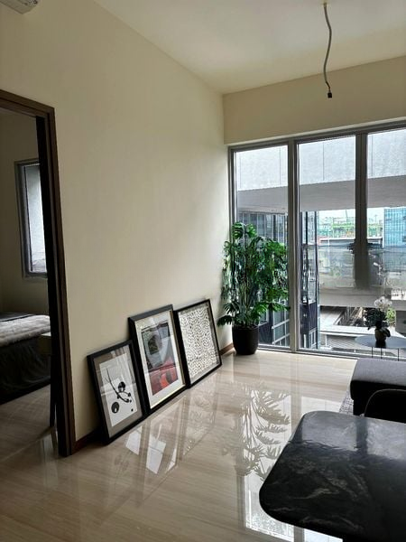Step into a bright and airy sanctuary at BIJOU, where abundant natural light floods through floor-to-ceiling glass windows, framing breathtaking views of the pool, lush greenery, and the vibrant city skyline. The modern architectural facade and landscaped entrance create an inviting ambiance, making you feel instantly at home.