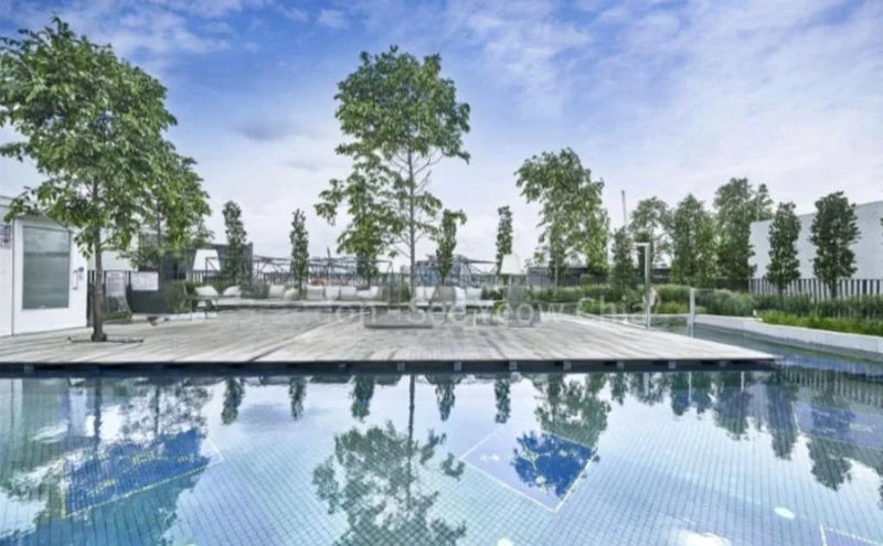 This well-maintained 1-bedroom unit boasts a thoughtful layout with a spacious living area that seamlessly connects to a private balcony, perfect for enjoying the urban landscape. The designer renovation features high-quality finishes and a central staircase that enhances the flow of the space. Residents can indulge in the luxurious rooftop swimming pool, complete with wooden decking and lounge seating, surrounded by integrated planters for a touch of nature.