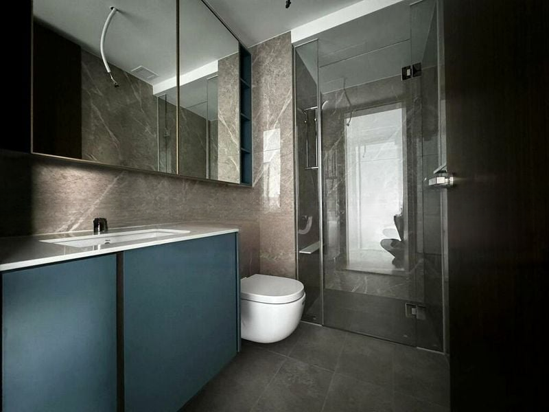 This efficient 63 sq m (678 sq ft) layout features a seamless flow between the living area and the galley kitchen, equipped with quartz countertops and a built-in oven, perfect for culinary enthusiasts. The spacious balcony offers breathtaking high-floor views of the city skyline, while built-in storage cabinets in the hallway provide practical solutions for your storage needs.