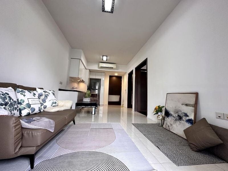 Step into a sanctuary of light and tranquility in this beautifully renovated 1-bedroom unit at Archipelago. The moment you enter, you're greeted by an abundance of natural light that dances across the polished tile flooring, highlighting the stunning stone-textured feature wall. With sliding glass doors leading to a balcony that offers unobstructed views of lush greenery and the inviting pool, this space feels both expansive and intimate.