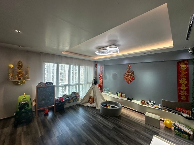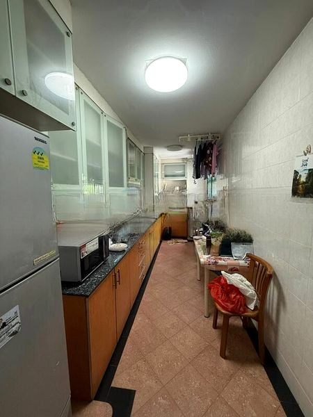 Step into this beautifully renovated 4-room point block end unit and be greeted by a warm and inviting ambiance, enhanced by dark wood-look flooring and a recessed ceiling adorned with elegant circular LED fixtures. Large windows draped with sheer curtains invite natural light, framing views of the surrounding high-rise buildings and lush greenery, creating a serene urban retreat.