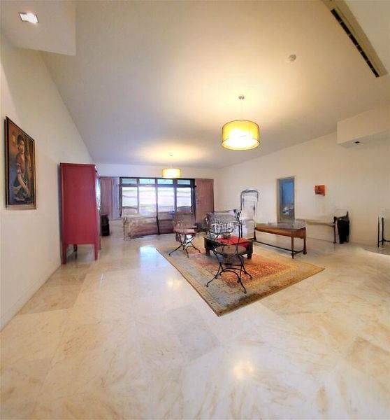 Step into a bright and airy sanctuary where abundant natural light floods the spacious living areas, accentuating the elegant marble flooring and high ceilings. The large windows frame breathtaking views of lush greenery and the city skyline, creating a serene backdrop that invites relaxation and comfort.