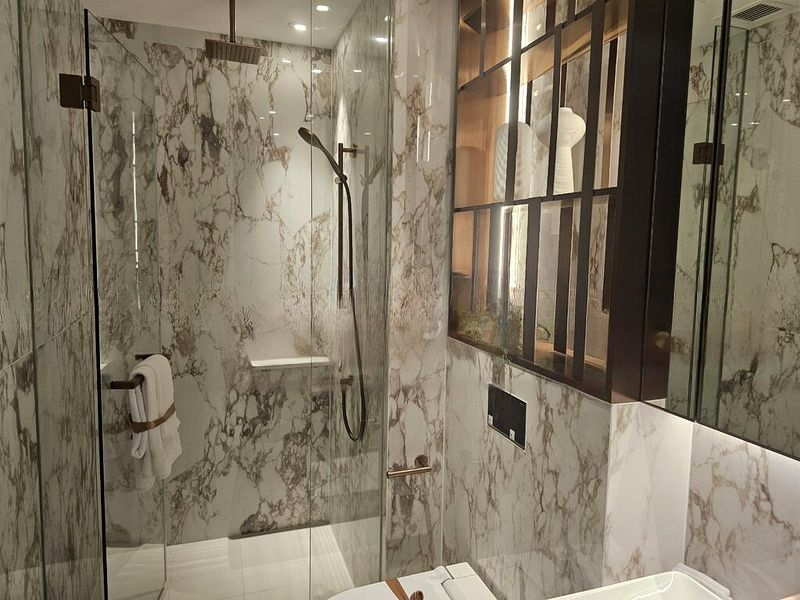 This spacious 4-bedroom unit features standout rooms, including a gourmet kitchen equipped with integrated appliances, a gas hob, and dark stone backsplash, perfect for culinary enthusiasts. The master suite offers a serene retreat with custom wood shelving and a marble vanity desk, while the bathrooms are adorned with full-height marble-patterned tiles and luxurious rain showers. Every detail has been meticulously crafted, from the custom cabinetry to the integrated lighting, ensuring a sophisticated living experience.