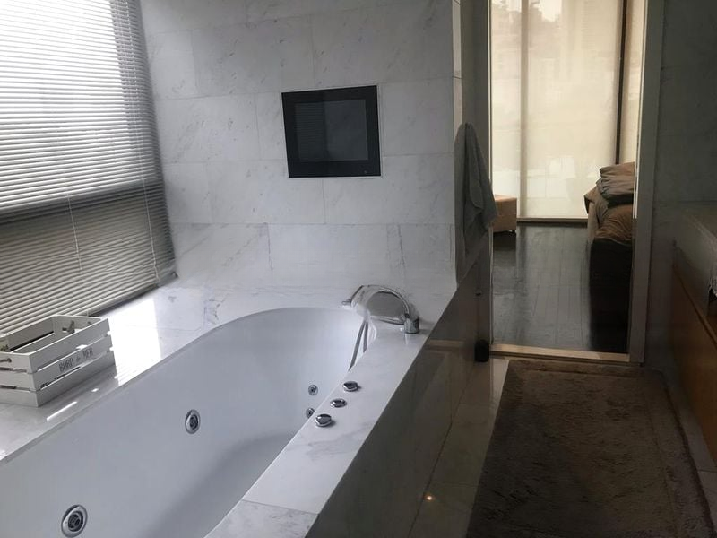 This well-maintained unit boasts a thoughtful layout with three bedrooms and three bathrooms, including a lavish master suite with direct balcony access. The standout features include a large oval jet bathtub in the bathroom, an integrated wall-mounted TV, and a spiral staircase leading to an expansive private roof terrace. Perfect for alfresco dining, this outdoor oasis is adorned with planter boxes, making it an ideal space for relaxation and entertaining.