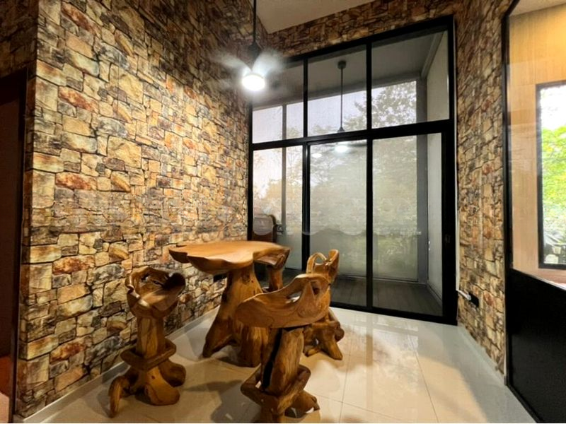 Step into a serene oasis at Kandis Residence, where abundant natural light floods the space, highlighting the rustic charm of the fully-furnished unit. The inviting ambiance is enhanced by a large coastal wall mural and stone-patterned feature wallpaper, creating a warm and welcoming atmosphere. Enjoy the lush greenery views from the glass-partitioned kitchen and the balcony, perfect for relaxation.