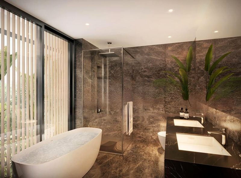 This exquisite unit features five spacious bedrooms, each adorned with polished wood flooring and ensuite access. The standout master bathroom boasts a luxurious freestanding bathtub and stunning brown marble finishes, while the expansive roof terrace and private lap pool provide the perfect backdrop for entertaining or unwinding. With high-end finishes throughout, including full-height marble bathroom walls and a contemporary design, this home is a true masterpiece.
