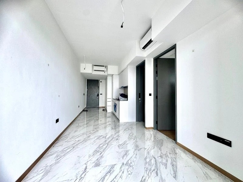This efficient 753 sqft layout boasts standout features including a spacious living room with a full-length built-in TV console and balcony access, a master bedroom with an en-suite bathroom and designer pendant lights, and a second bedroom equipped with a space-saving bunk bed and integrated study area. The bathrooms are adorned with luxurious marble-look tiles and rain shower heads, ensuring a touch of opulence in your daily routine.