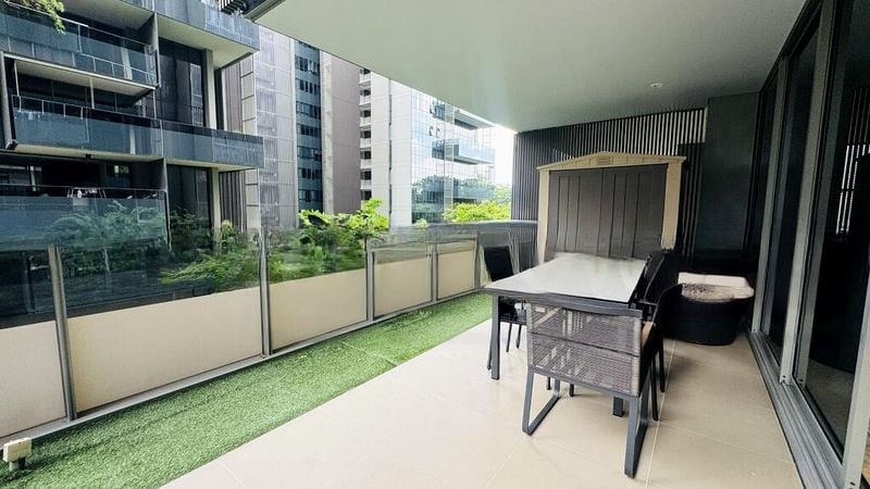 Step into a world of modern elegance as you enter this stunning unit at Leedon Residence. The abundant natural light floods the open-concept living and dining area, highlighting the exquisite marble-look floor tiles and the striking dark patterned feature wall. Large sliding glass doors provide direct access to your private lap pool, creating a seamless indoor-outdoor living experience surrounded by lush greenery.