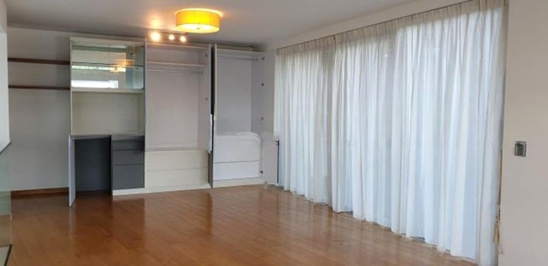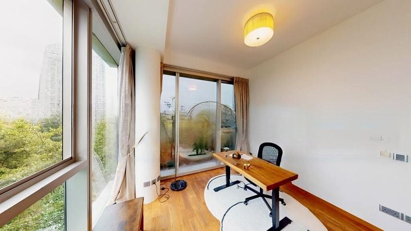 This well-maintained 2-bedroom, 2-bathroom unit features a spacious living room with elegant pendant lighting and a modern layout that maximizes space. The bedrooms boast wood flooring and built-in white wardrobes, while the bathrooms are adorned with luxurious marble-look finishes, including a bathtub and wall-hung toilets for a touch of sophistication.