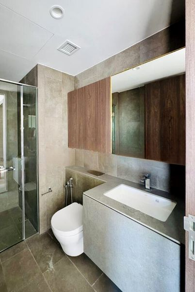 This thoughtfully designed 2-bedroom unit features a spacious living area with large format floor tiles, seamlessly connecting to the integrated kitchen equipped with dark wood cabinetry and state-of-the-art appliances. The bathroom boasts luxurious finishes, including a rain shower and stone vanity top, while the bedroom offers a cozy retreat with a built-in wardrobe featuring internal lighting. Every detail has been meticulously crafted for comfort and style.