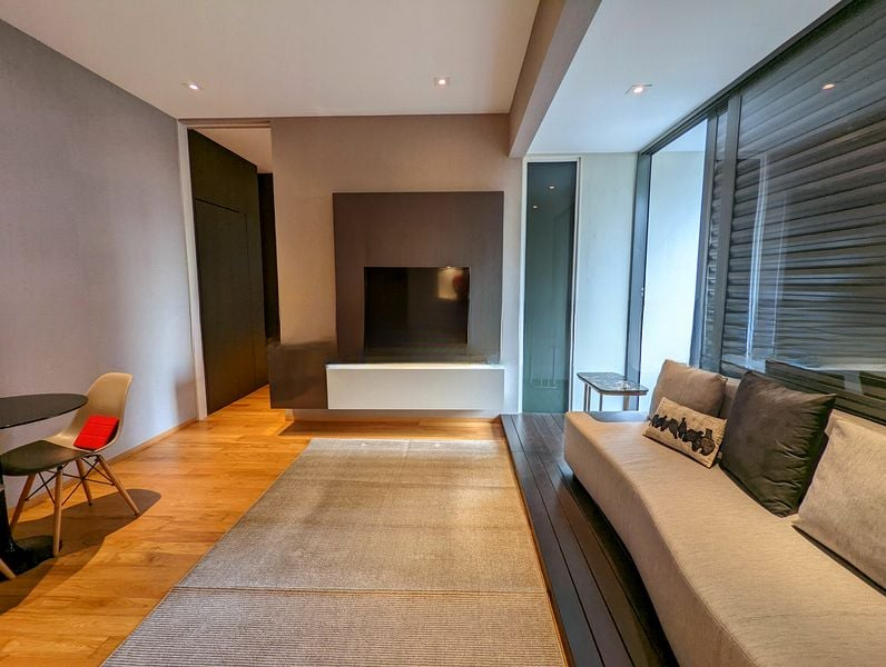 Step into a modern minimalist haven where natural light dances across light wood flooring, illuminating the sleek finishes and designer touches throughout. The open-concept living area, accentuated by a built-in TV feature wall and recessed lighting, invites you to unwind while enjoying serene views of lush greenery from your balcony.