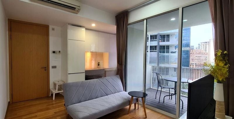 Step into a modern minimalist haven where natural light dances across light wood flooring, illuminating the sleek finishes and designer touches throughout. The open-concept living area, accentuated by a built-in TV feature wall and recessed lighting, invites you to unwind while enjoying serene views of lush greenery from your balcony.