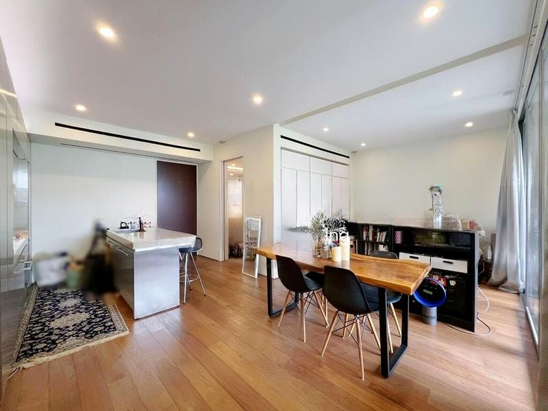This well-maintained unit boasts standout features such as a stainless steel kitchen with integrated appliances, a stunning stone countertop island, and a live-edge wooden dining table that adds a unique touch. The bathroom is elegantly designed with a wall-hung toilet and a glass shower enclosure, ensuring both style and functionality. Enjoy the outdoor space on your private balcony, complete with wooden decking and vertical privacy slats, ideal for unwinding after a long day.