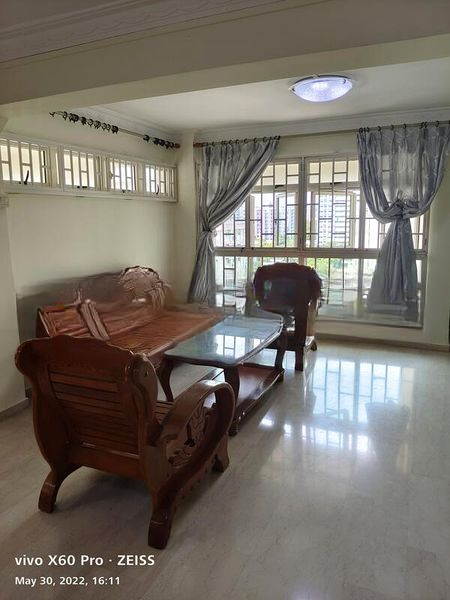 Step into this spacious 3-bedroom HDB flat and feel the functional charm of its original finishes. The large windows invite moderate natural light, illuminating the polished tile flooring and offering a glimpse of the urban landscape outside. The traditional wooden sofa set in the living room creates a cozy ambiance, perfect for unwinding after a long day.