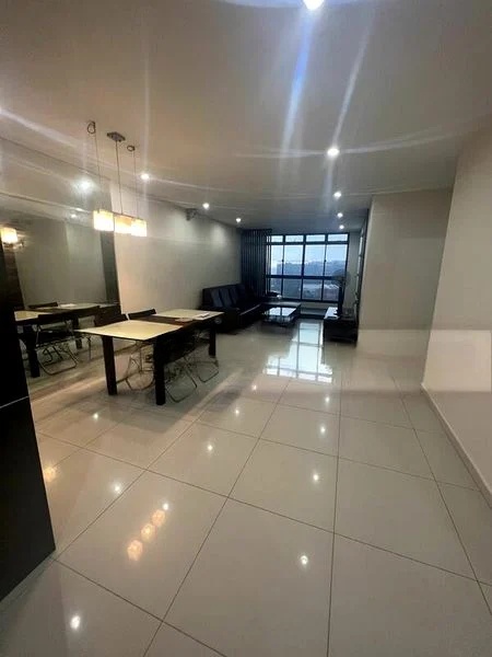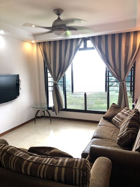 Step into this inviting HDB flat and be greeted by a warm ambiance, enhanced by the natural light streaming through the floor-to-ceiling windows. The spacious living room, adorned with large format floor tiles and a comfortable grey fabric sofa, creates a perfect setting for relaxation and gatherings. The mirrored wall in the dining area adds a touch of elegance, making the space feel even larger and more open.