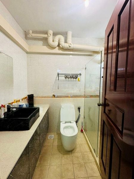 This well-maintained unit features three bedrooms, each with polished wood flooring and built-in sliding wardrobes, ensuring ample storage. The master bedroom boasts a recessed bookshelf niche and a cozy shag rug, while the bathrooms are fitted with modern glass shower partitions and stylish tiled walls. The open-concept layout seamlessly connects the living and dining areas, ideal for entertaining.