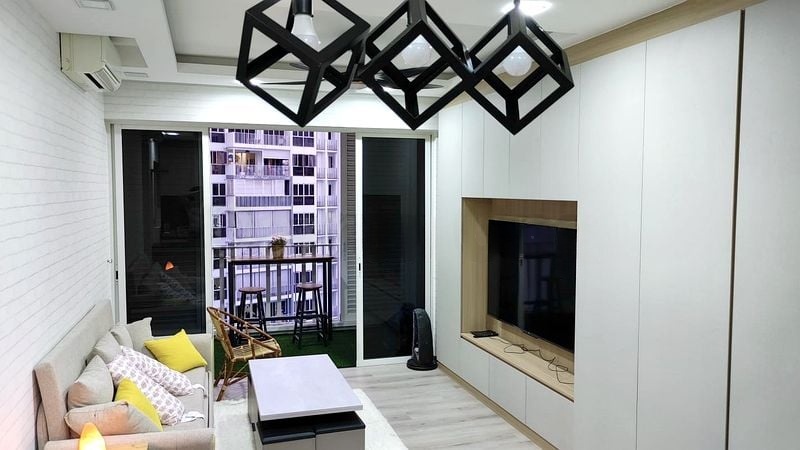 Step into a world of modern elegance as you enter this beautifully renovated unit at Forestville. The living room greets you with integrated full-height cabinetry and a striking brick-patterned wallpaper, while geometric pendant lights illuminate the space, creating a warm and inviting ambiance. Enjoy the city views from your balcony, complete with artificial turf, perfect for relaxation or entertaining.