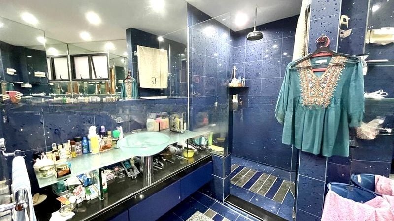 This well-maintained unit features an open-concept dining area with a stylish round glass table, seamlessly connecting to a kitchen equipped with wooden cabinetry and modern appliances. Each of the three bedrooms boasts herringbone parquet flooring and built-in floor-to-ceiling wardrobes, ensuring ample storage. The bathrooms are designed for comfort, with a luxurious bathtub and elegant marble-patterned tiles enhancing the overall aesthetic.