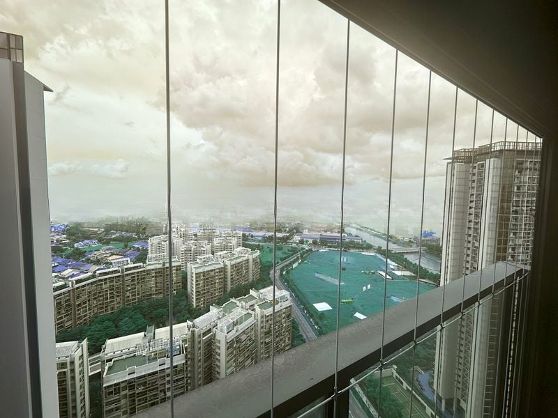Step into a bright and airy sanctuary at Whistler Grand, where abundant natural light floods the open-plan living and dining area, accentuated by polished tile flooring and elegant pendant lighting. The seamless flow to the balcony offers panoramic views of the city skyline, lush greenery, and distant sea, creating an inviting atmosphere that feels both expansive and intimate.