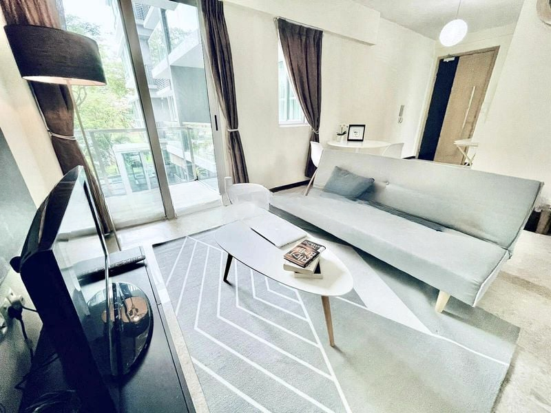 Step into a serene oasis where abundant natural light floods the modern minimalist interiors of this beautifully maintained unit. With floor-to-ceiling balcony doors, the living room invites you to unwind while enjoying picturesque views of the pool and lush greenery. The ambiance is enhanced by sleek finishes and a geometric rug that complements the contemporary furnishings, creating a space that feels both inviting and sophisticated.