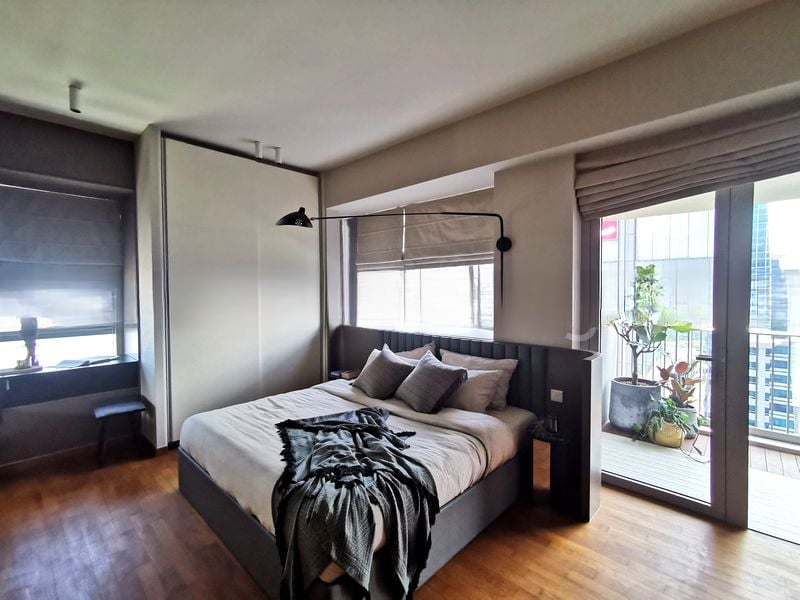 Step into a world of elegance as you enter this beautifully designed unit at V ON SHENTON. Abundant natural light floods the open-concept dining area, highlighting the sleek finishes and designer pendant lighting. The pegboard feature wall adds a unique touch, while the breakfast bar invites you to enjoy casual meals with stunning views of the sea, port, and city skyline.