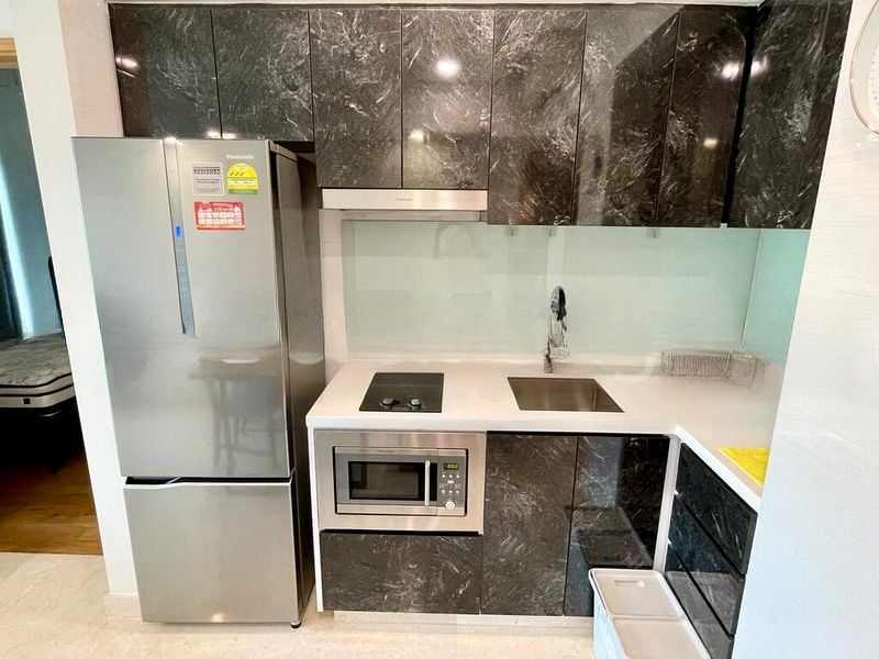 Step into a world of modern elegance as you enter this beautifully renovated unit at EIGHT RIVERSUITES. Bathed in abundant natural light, the open-concept living and dining area seamlessly flows onto a private balcony, offering unobstructed views of lush greenery and the vibrant surroundings. The minimalist finishes, including marble-patterned wardrobes and cabinetry, create a sophisticated ambiance that invites relaxation and comfort.