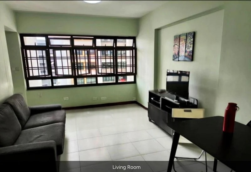 Step into a functional and simple abode where large living room windows invite natural light and offer an urban view of the surrounding neighborhood. The light green painted walls create a refreshing ambiance, while the tiled flooring adds a touch of practicality to your everyday living.