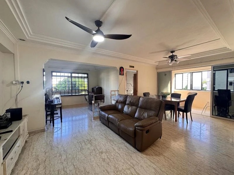 Step into a bright and airy sanctuary at 228 Pasir Ris St 21, where abundant natural light floods the spacious open-plan living area, enhanced by elegant marble-patterned floor tiles and dual ceiling fans. The coved ceiling adds a touch of sophistication, creating an inviting ambiance that feels both modern and comfortable.