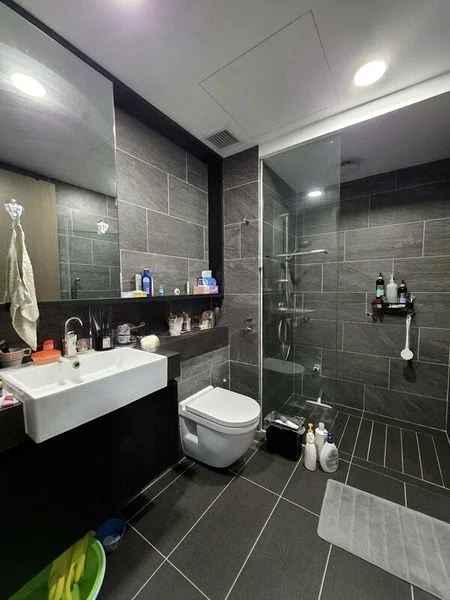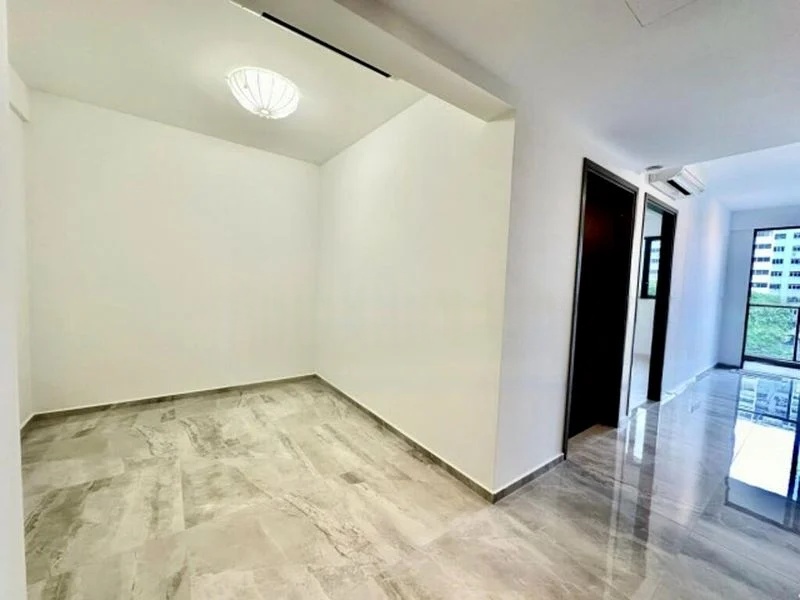 Step into a world of modern elegance as you enter this beautifully renovated unit at Affinity at Serangoon. Bathed in abundant natural light, the living area features large format grey marble-look floor tiles that seamlessly connect to a private balcony, offering unobstructed views of the expansive curved swimming pool and the vibrant city skyline. The minimalist decor and circular ceiling lights create an inviting ambiance, perfect for relaxation or entertaining.