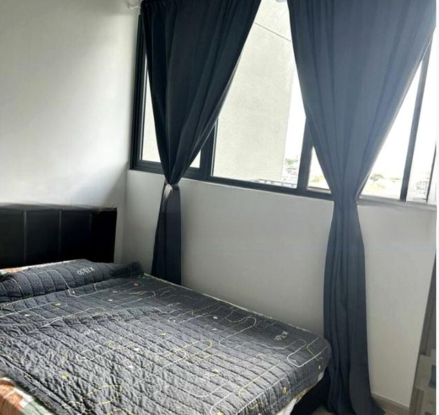 This one-bedroom unit boasts a well-thought-out layout, with a spacious bedroom adorned with dark grey blackout curtains and a large window that frames the serene surroundings. The open living space flows effortlessly into the balcony, where the glass safety railing enhances the panoramic views. Enjoy the comfort of split-unit air conditioning throughout the unit, ensuring a cool retreat in the heart of Serangoon.