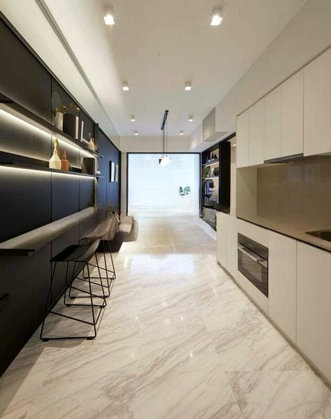 This efficient 46 sqm layout maximizes space with an open-plan kitchen equipped with white cabinetry and an integrated oven, complemented by a breakfast bar with shelving. The bedroom boasts an en-suite bathroom, showcasing full marble-look tiling, a luxurious rain shower, and a sleek black marble vanity. Every detail has been thoughtfully curated to provide a sophisticated living experience.