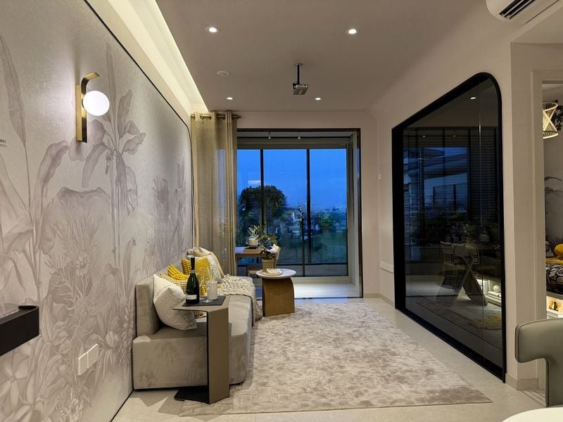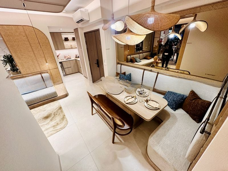 This brand-new 2-bedroom unit boasts a thoughtful layout, featuring a dining area with L-shaped built-in seating and woven pendant lights that enhance the space. The child-themed bedroom is perfect for young ones, complete with a built-in study desk and integrated shelving illuminated by LED strip lighting. The modern kitchen, equipped with minimalist cabinetry and integrated appliances, is both functional and stylish, ensuring an enjoyable cooking experience.