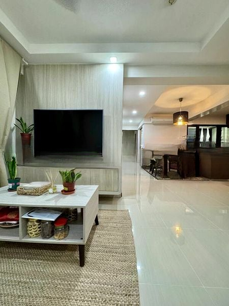 The galley kitchen is a standout feature, equipped with an overhead laundry rack and a top-load washing machine for your convenience. The bedrooms are thoughtfully laid out, with a wooden vanity desk in the master bedroom and a pedestal wash basin in the bathroom, complemented by floor-to-ceiling wall tiles. This unit is fully furnished, making it move-in ready for you and your family.