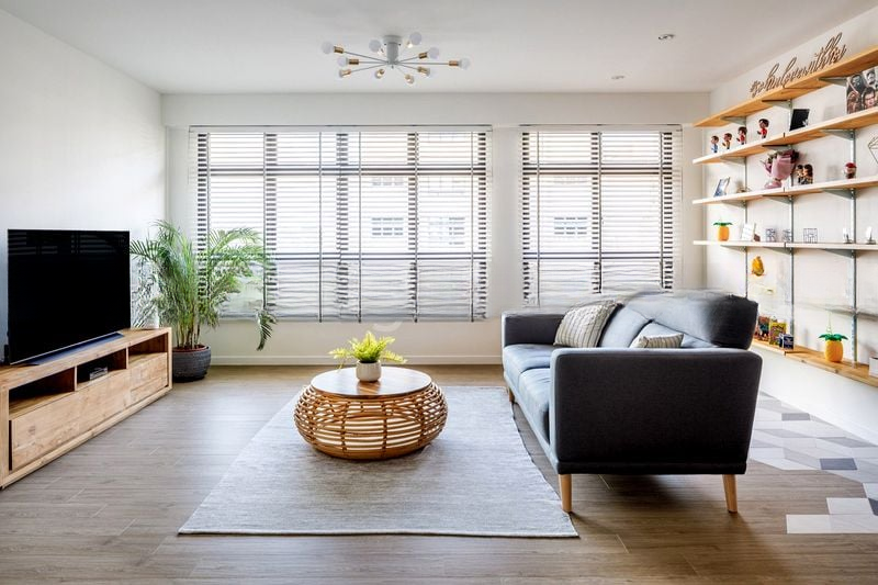 This well-maintained 3-bedroom flat boasts standout features including a glass-partitioned kitchen with sliding doors, a spacious dining area highlighted by a designer gold globe pendant light, and a cozy study nook with decorative hexagonal wall cutouts. Each room is thoughtfully designed, from the modern grey sofa in the living room to the serene bedroom with floor-to-ceiling curtains, ensuring comfort and functionality in every corner.