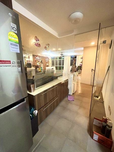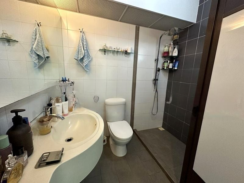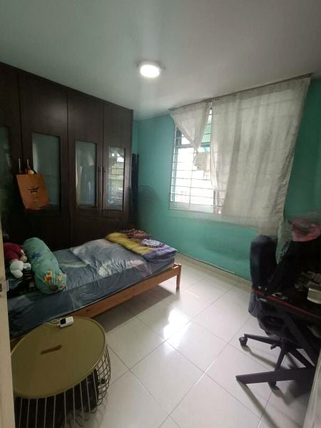 This efficient 4-room point block layout (Type 6B) boasts three spacious bedrooms, including a main bedroom with a built-in sliding wardrobe and wood flooring. The second bedroom doubles as a study, equipped with a built-in desk and overhead cabinets. The separate kitchen with a service yard enhances practicality, ensuring a clear demarcation between living and dining zones.