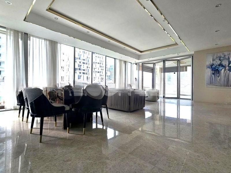 Step into a realm of modern luxury where abundant natural light floods the open-concept living space, accentuating the exquisite marble flooring and elegant cove lighting. The floor-to-ceiling windows offer breathtaking views of the city skyline, creating an ambiance that is both sophisticated and inviting.