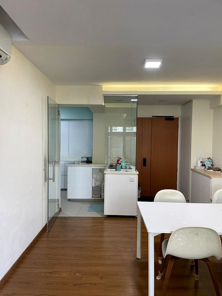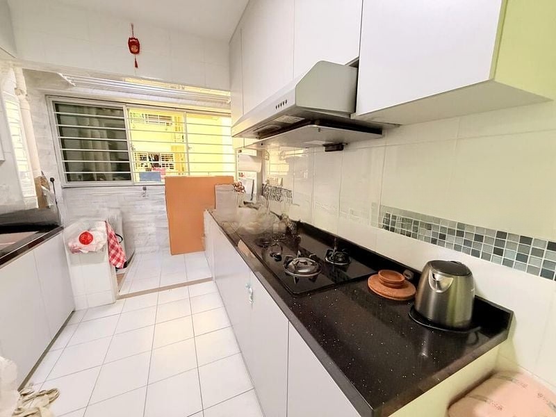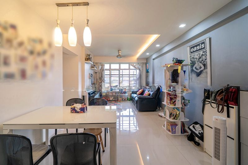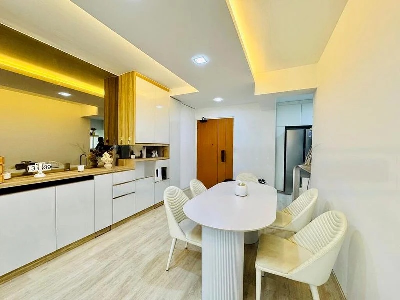 Step into this beautifully renovated 3-bedroom flat at SUMANG LINK and be greeted by an abundance of natural light that fills the open-concept living and dining area. The modern minimalist design is accentuated by a striking teal L-shaped sofa, a stylish TV feature wall, and large windows that offer captivating urban views. The ambiance is enhanced by cove lighting and a false ceiling with recessed lights, creating a warm and inviting atmosphere.
