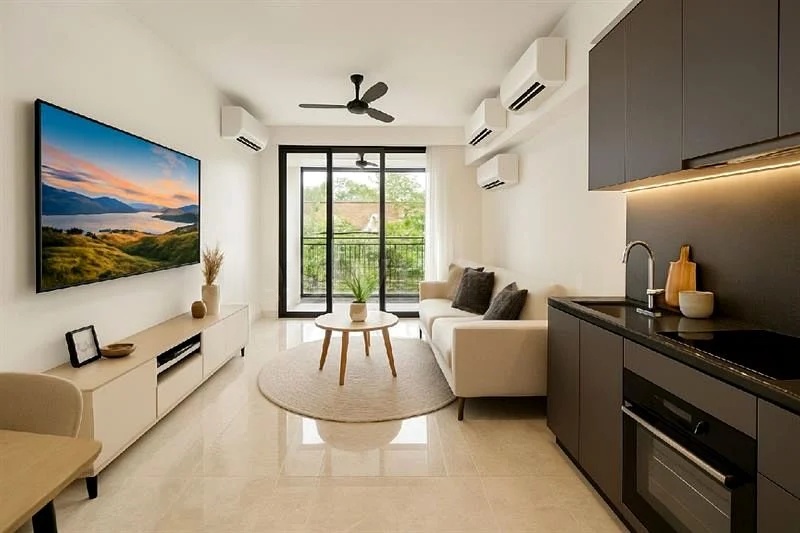 Step into a world of elegance as you enter this brand-new unit at Daintree Residence. The abundant natural light floods through the floor-to-ceiling windows, highlighting the exquisite marble-look floor tiles and creating a warm, inviting ambiance. The high ceilings amplify the sense of space, while the views of lush greenery and neighboring residential buildings provide a serene backdrop.