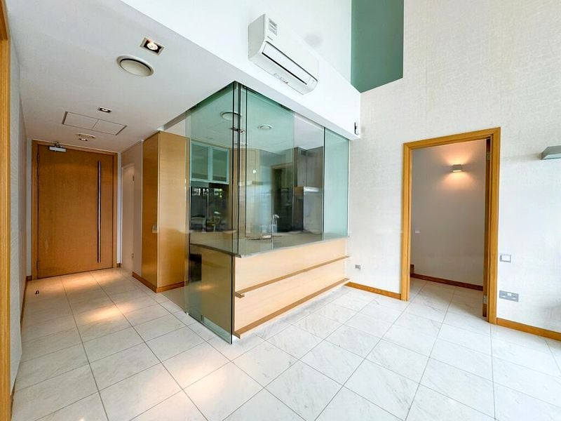 Step into a world of elegance and light as you enter this beautifully maintained 1-bedroom unit at ICON. The double-volume high ceiling and floor-to-ceiling windows create an inviting atmosphere, flooding the space with natural light and offering breathtaking views of the city skyline. The bright and airy ambiance is complemented by tasteful furnishings, including a stylish L-shaped grey sofa and a patchwork accent chair that adds character to the living area.