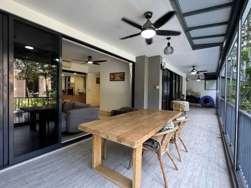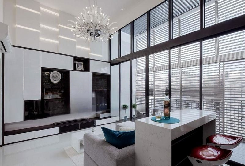 This exquisite home boasts standout features including a private rooftop terrace adorned with dark wood decking and artificial turf, perfect for outdoor entertaining. The living room is a masterpiece, showcasing a modern chandelier and a marble-look bar counter, while the master bedroom offers a plush platform bed with integrated storage and a built-in vanity. The walk-in closet is a designer's dream, featuring track lighting and extensive shelving for your shoe collection.