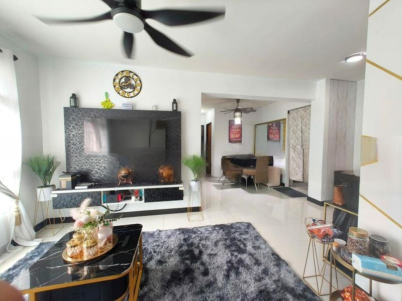 Step into a world of modern elegance as you enter this beautifully renovated HDB flat at 805A Keat Hong Cl. The open-concept living area greets you with a striking textured black feature wall, complemented by large windows draped in sheer white curtains that allow natural light to filter through, creating a warm and inviting ambiance. The bold geometric wall art and plush shaggy area rug add a contemporary flair, making it the perfect space for relaxation and entertainment.