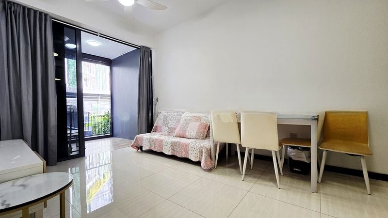 Step into a serene oasis at GEM RESIDENCES, where modern minimalist design meets functionality. The moment you enter, you are greeted by an abundance of natural light flowing through the open-concept living area, accentuated by sleek tiled flooring and a balcony that offers refreshing views of lush greenery and neighboring buildings.