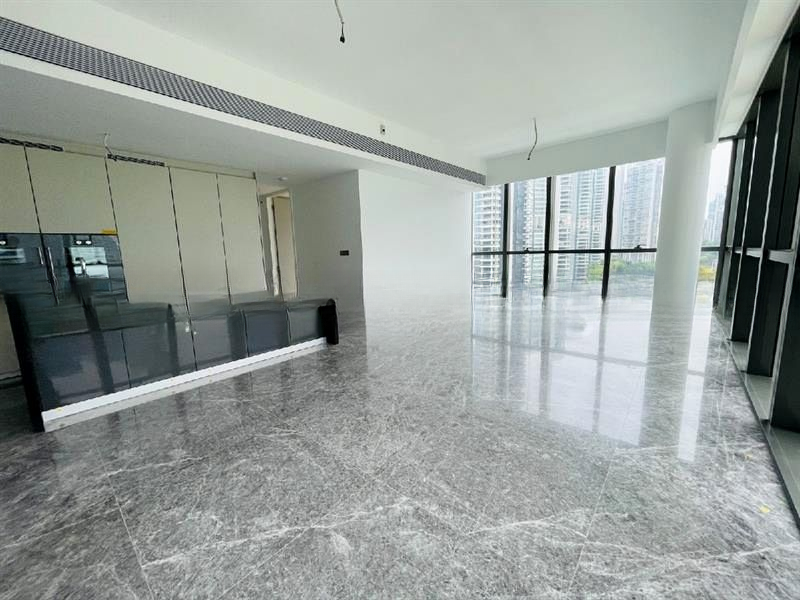 This brand-new unit features three spacious bedrooms, each adorned with light wood flooring and large windows that frame picturesque vistas. The modern kitchen boasts a stylish island counter with an integrated sink, complemented by minimalist cabinetry and sleek black countertops. The bathrooms are designed for relaxation, featuring luxurious marble-look wall tiles and a bathtub for unwinding after a long day.
