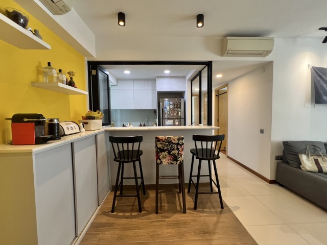 Step into a world of modern elegance as you enter this beautifully renovated unit at A Treasure Trove. Bathed in abundant natural light, the open-concept living area features a full-height built-in TV console and an L-shaped sofa, seamlessly leading to a balcony that offers breathtaking views of the pool and lush greenery. The ambiance is enhanced by stylish track lighting, creating a warm and inviting atmosphere.