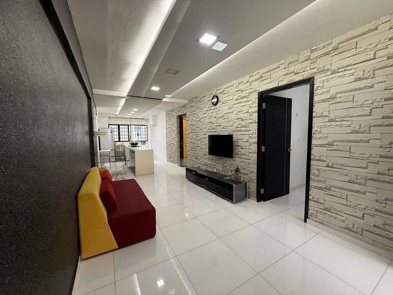 Step into a beautifully renovated space where modern minimalist design meets functionality. The open-concept living room welcomes you with a striking stone-textured feature wall and a dark accent wall that creates a sophisticated ambiance. Natural light filters through the windows, enhancing the large format floor tiles and the elegant false ceiling with recessed lighting, making the space feel both inviting and spacious.