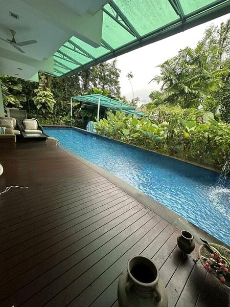 Step into a world of luxury as you enter this exquisite home at Kim Lin Park. The bright and airy ambiance is accentuated by abundant natural light streaming through large floor-to-ceiling windows, offering picturesque views of the private swimming pool and lush tropical landscaping. The designer chandelier adds a touch of elegance, creating an inviting atmosphere that feels both spacious and intimate.