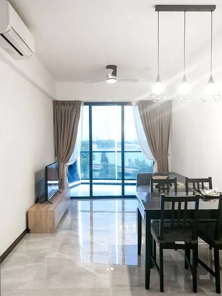 Step into a bright and airy sanctuary at Lake Grande, where abundant natural light floods the open-concept living and dining area, accentuated by modern pendant lighting and elegant marble-look floor tiles. Enjoy unblocked views of the serene lake and lush greenery from the floor-to-ceiling windows, creating a tranquil ambiance that invites relaxation.