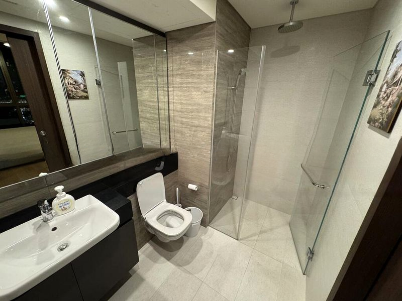 Highlights: Modern minimalist design, City skyline views, Open-concept kitchen, Luxurious rain shower, Convenient MRT access